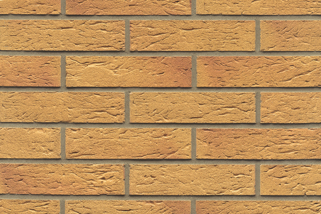 Kolor klinkieru Gelbbunt Rustik (Nummer L 02) z zakładu Muhr Lichterfeld to żywa, ciepła mieszanka żółto‑czerwonych tonów podkreślona wyraźnie rustykalną, lekko chropowatą fakturą – dzięki powierzchni „Rustik” cegła zyskuje autentyczny charakter ręcznie formowanego kamienia, zaś pstrokate przeplatania barw czynią elewację dynamiczną, naturalną i pełną głębi.